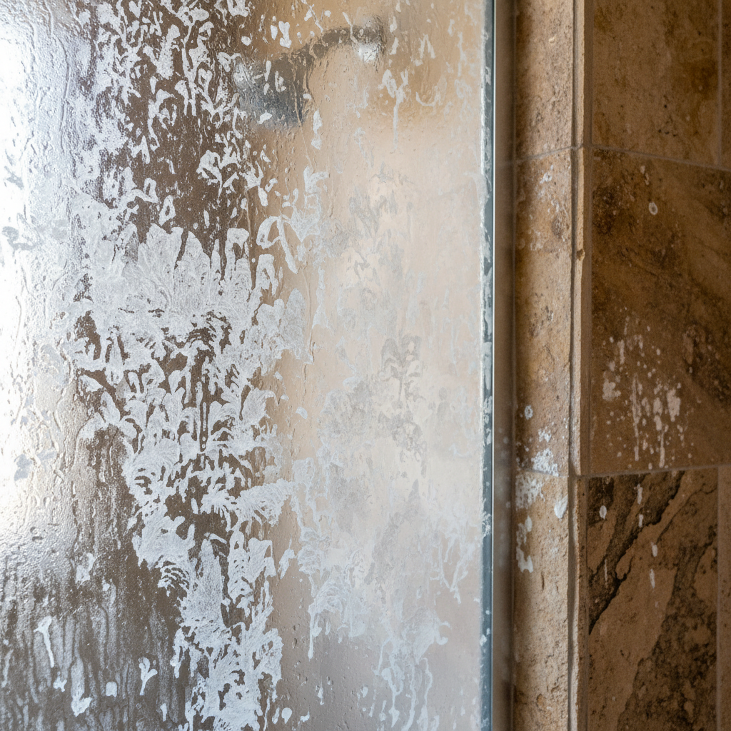 Quartz countertops and surfaces are non-porous, so hard water deposits stay entirely on the surface. They're the easiest to clean but can still develop visible buildup in wet areas.
