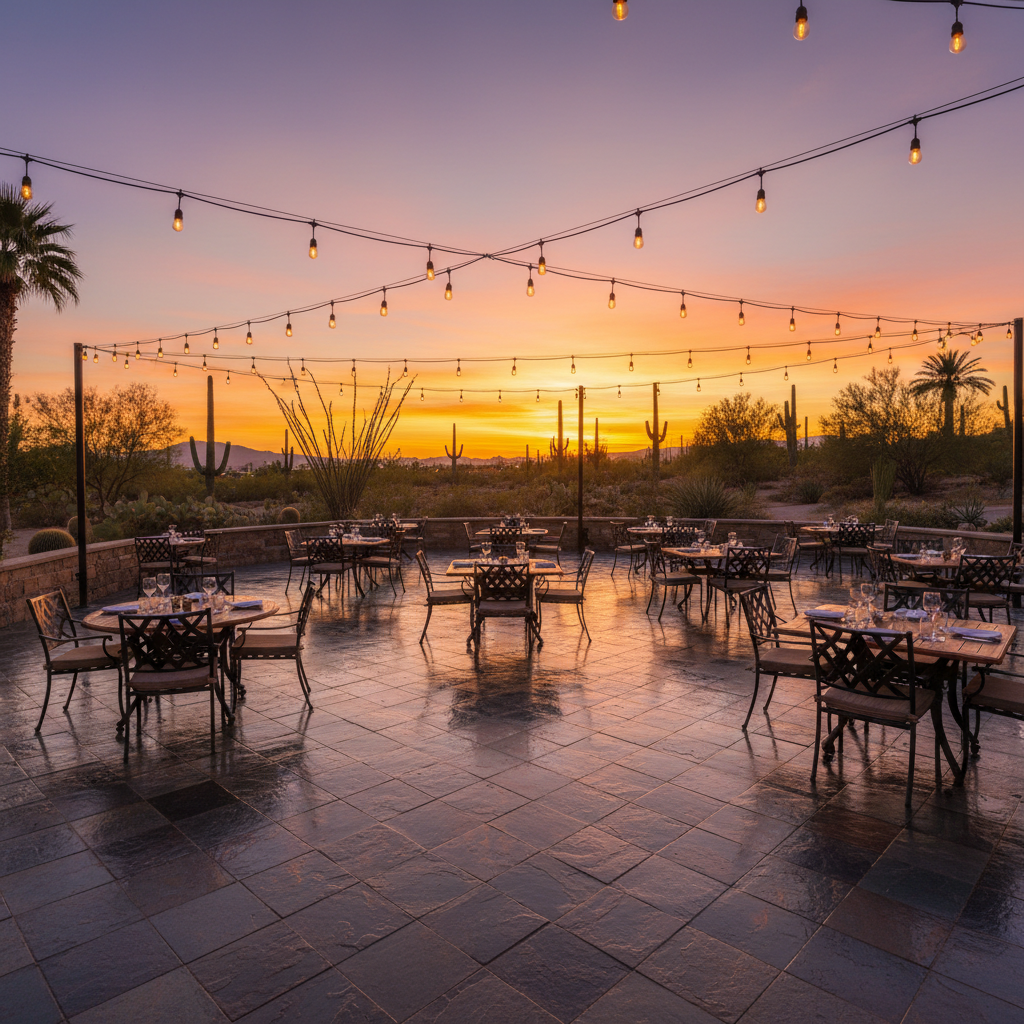 Desert dust in texture: Slate's natural cleft surface traps fine desert particulate more readily than smooth stones. Daily sweeping is especially important. Consider a HEPA vacuum with a brush attachment for deep texture cleaning.
